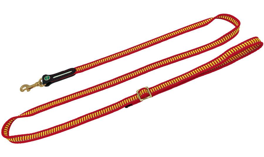 Neu und einmalig in Gestaltung und Funktion ist der Bereich der Leine zwischen Führer und Hund. Das gummiarmierte und mit Noppen versehene Material garantiert den sicheren und angenehmen Griff bei der Führung des Hundes